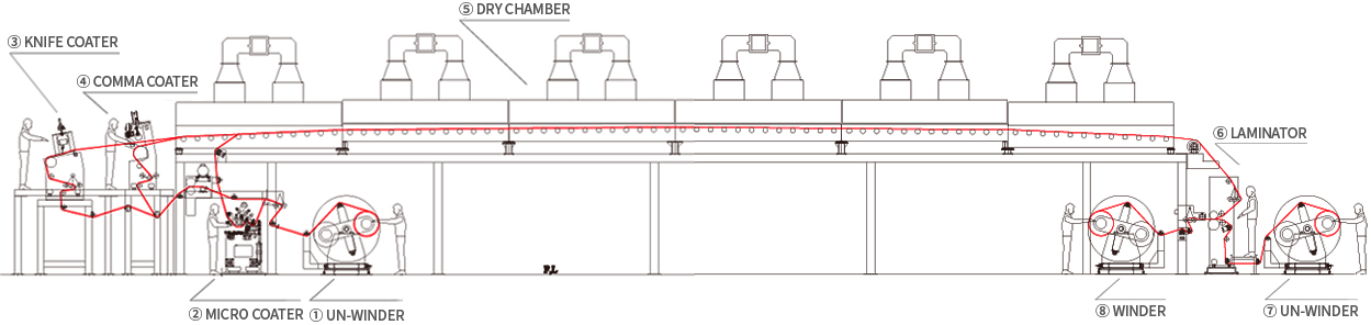 1,200~2,000mm | 10~60m/min | 5~110μ | 1st Gravure or Micro Coater 2nd Comma Coater 3rd Knife Coater |